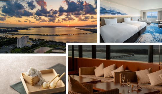 浜名湖と遠州綿紬からインスピレーションを受けてデザインされた壁紙のアートが特徴のエグゼクティブツインや、広々とした和洋室など幅広いタイプの客室をご用意。客室から浜名湖や遠州灘の景色をひとり占め。窓から差し込む自然光とともに、四季折々の美しい風景を愉しみながら、贅沢なひとときをお愉しみください。